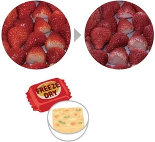 Recently, freeze-dried foods have become very popular, ranging from vegetable chips and fruits to instant miso soup, soups, cooking ingredients, and even emergency rations. By freezing food or raw materials containing moisture and then removing the water while still frozen, a freeze-dried product is created with its primary components intact.