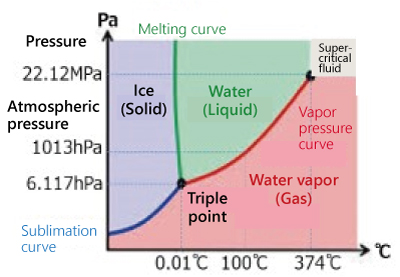 Under atmospheric pressure, water changes from ice (solid) to water (liquid) to Water vapor (gas). However, at pressures below the triple point, it can be seen that the state changes directly from solid to gas (sublimation) without passing through the liquid phase.